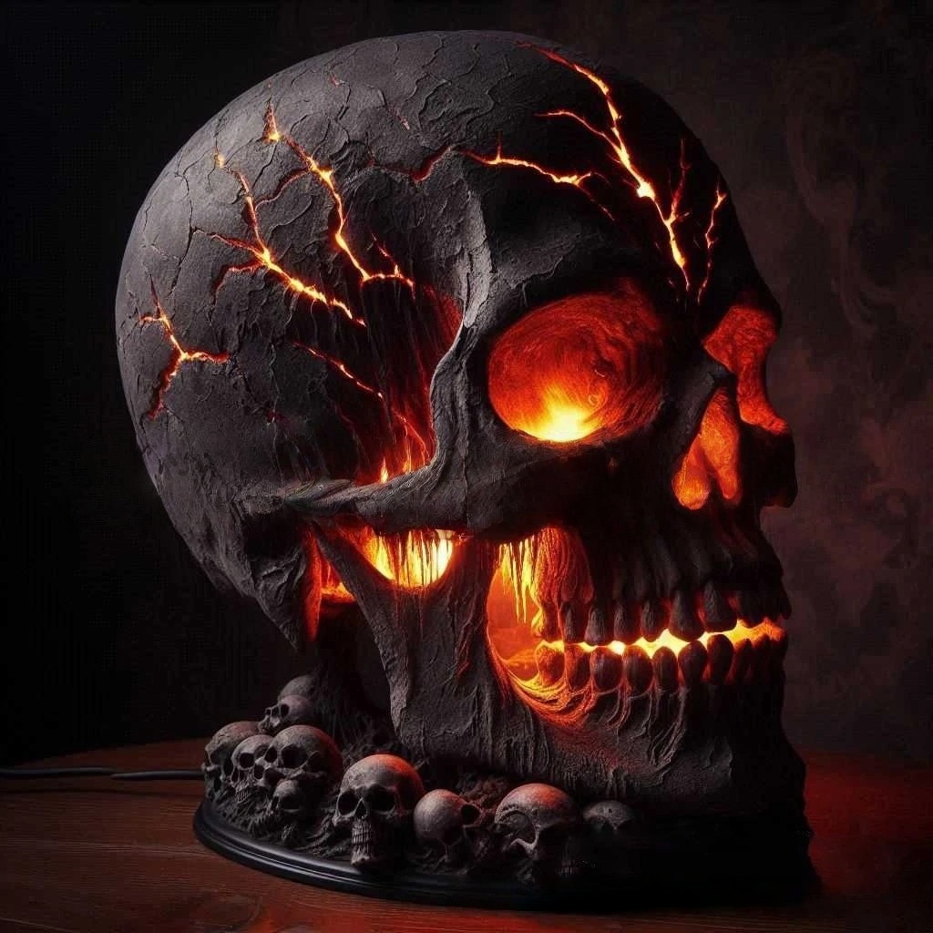 Handcrafted skull night lights are cast from custom molds using hand-poured resin. Each piece is handcrafted for hours or days to create unique details and then treated with various stains and colors.