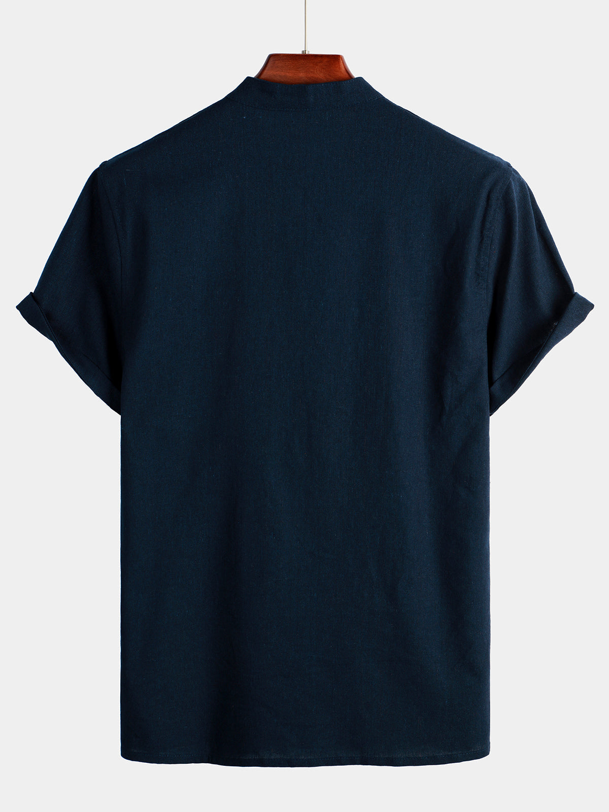 Men's Solid Color Stand Collar Half Button Pocket Front Shirt