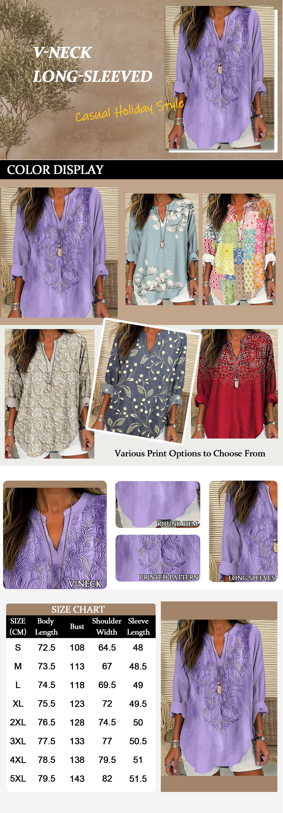 Summer Small V-neck Long-sleeved Floral Print Simple Casual Elegant T-shirt