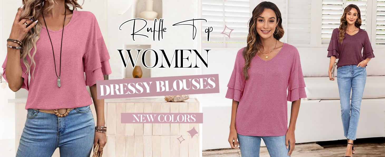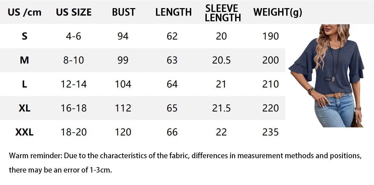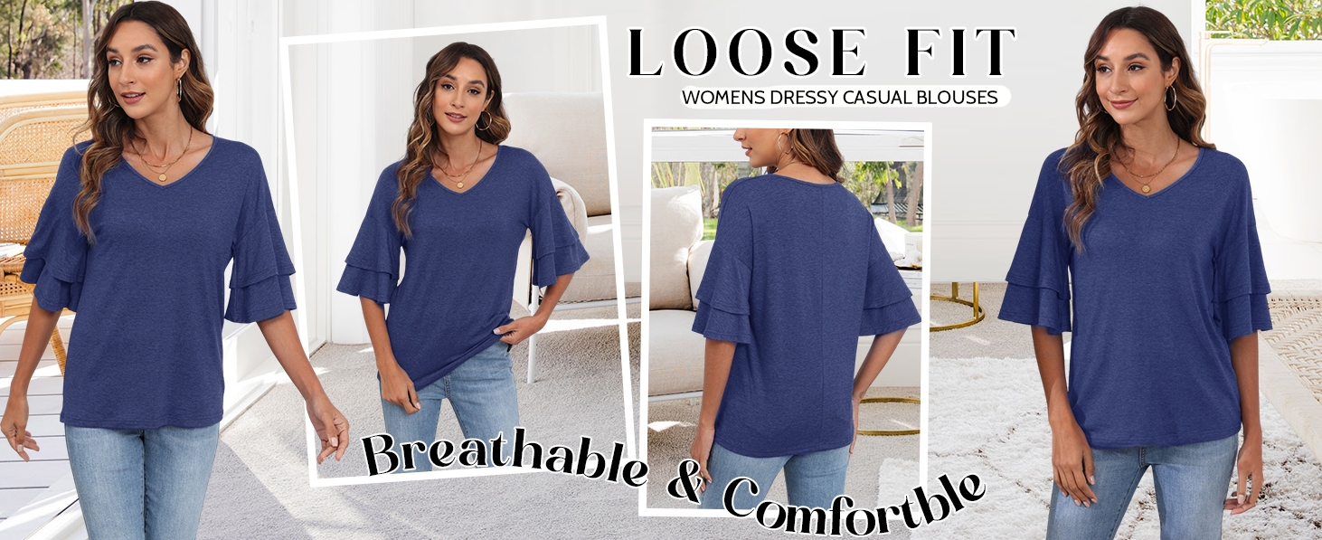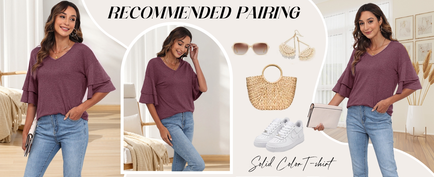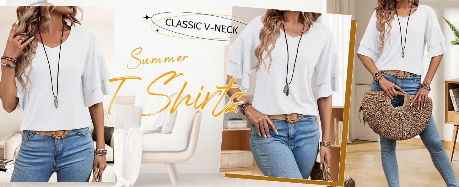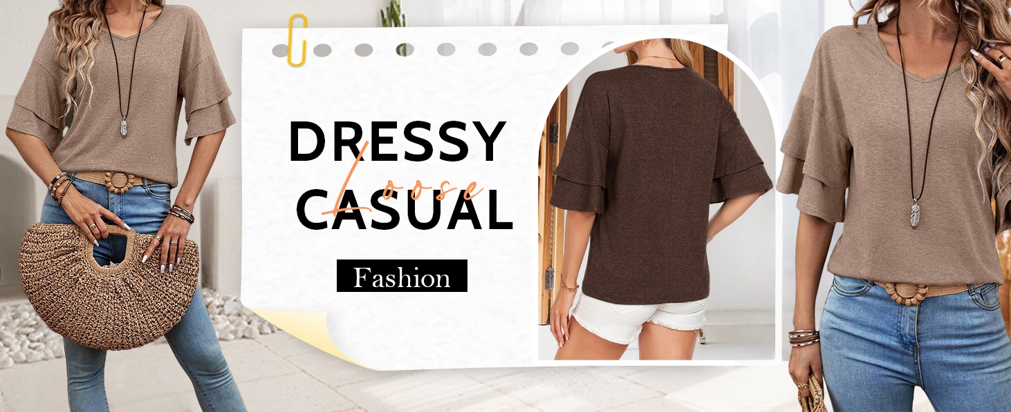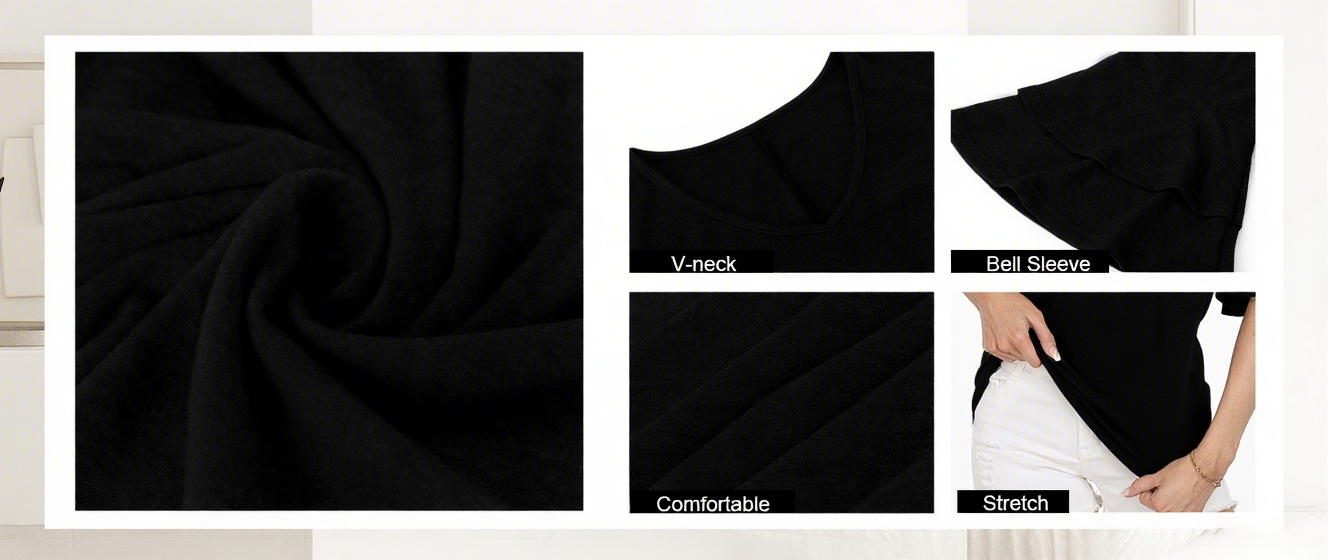 Feature: v neck, layered sleeve, drop shoulder, solid, bell sleeve tee top for women