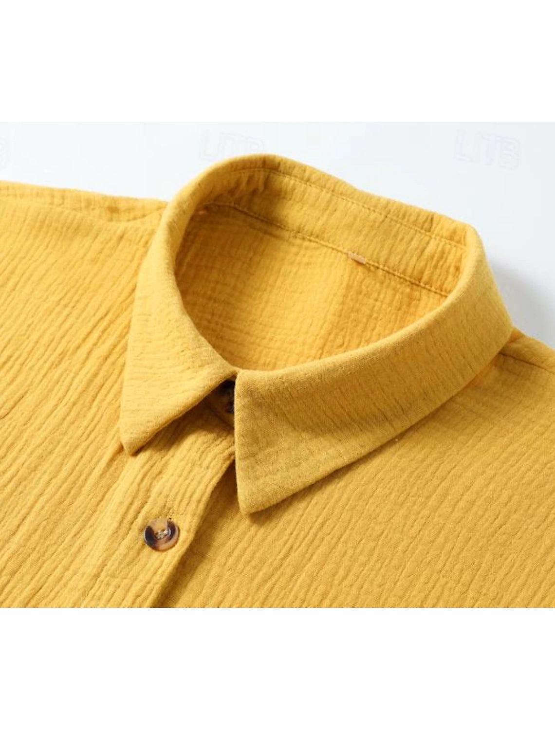 [Design Highlights] The dress showcases a classic button-down front with rustic wooden-style buttons, adding a touch of natural charm. The short sleeves can be rolled up for a laid-back look, and large front pockets enhance its practicality.